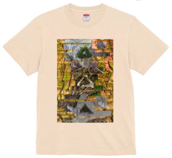 三角形は直線でできる最小単位の図形。人間社会では三は関係を示す場面でいろいろと用いられてきています。三位一体、三権分立、三すくみ等々。2020年に自然の中で見つけた苔・根・石でできた三角形を並べて制作された作品「Three triangles」をプリントしています。